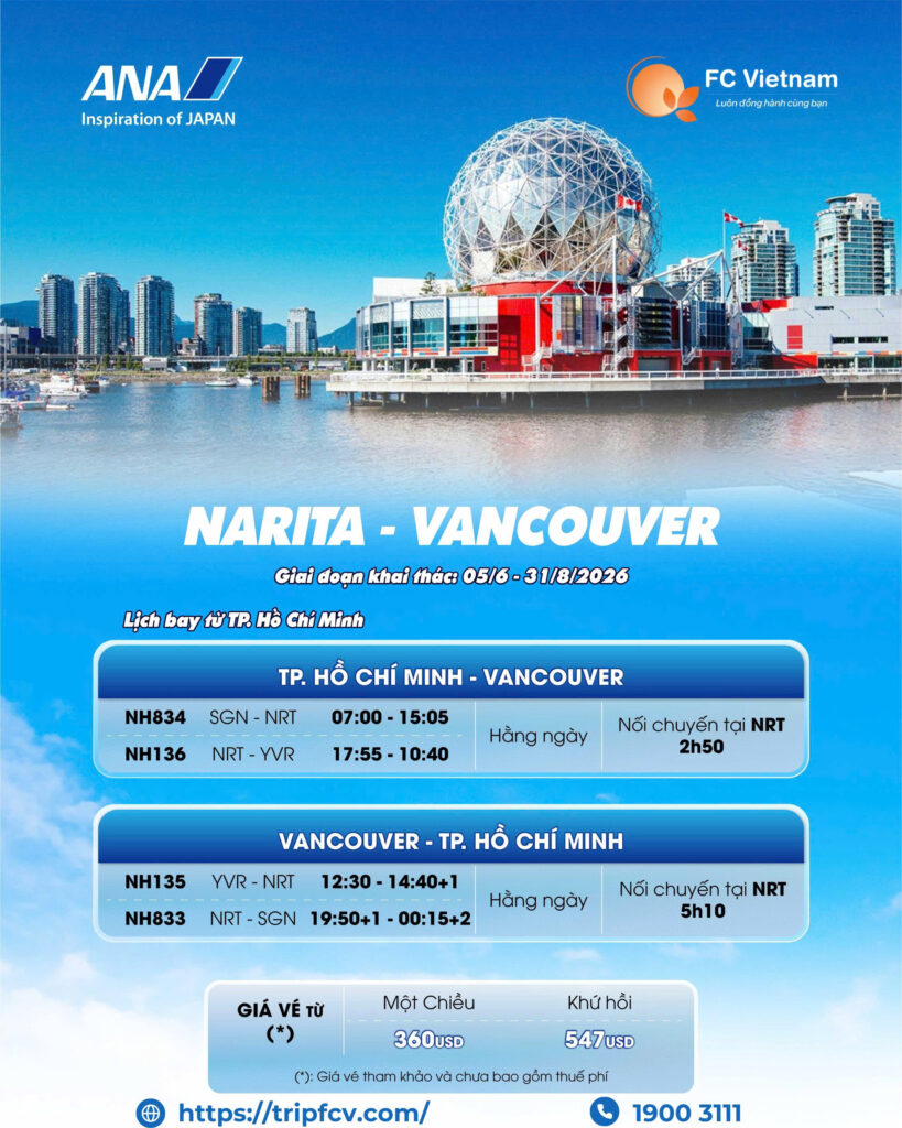 All Nippon Airways (ANA) chính thức khai thác đường bay kết nối Narita (Tokyo) – Vancouver trong mùa cao điểm hè 2026, mang đến thêm lựa chọn thuận tiện cho hành trình từ Việt Nam đi Canada.