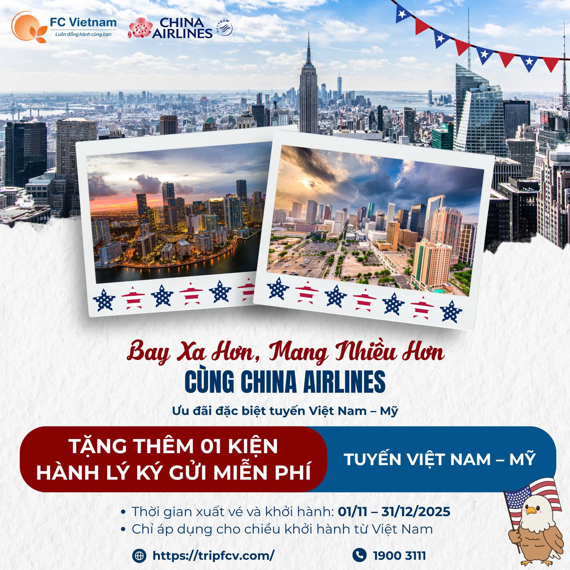 Cùng China Airlines bay xa hơn, mang nhiều hơn với ưu đãi hành lý miễn phí dành riêng cho hành trình Việt Nam – Mỹ, giúp chuyến đi của bạn thêm thoải mái và trọn vẹn.