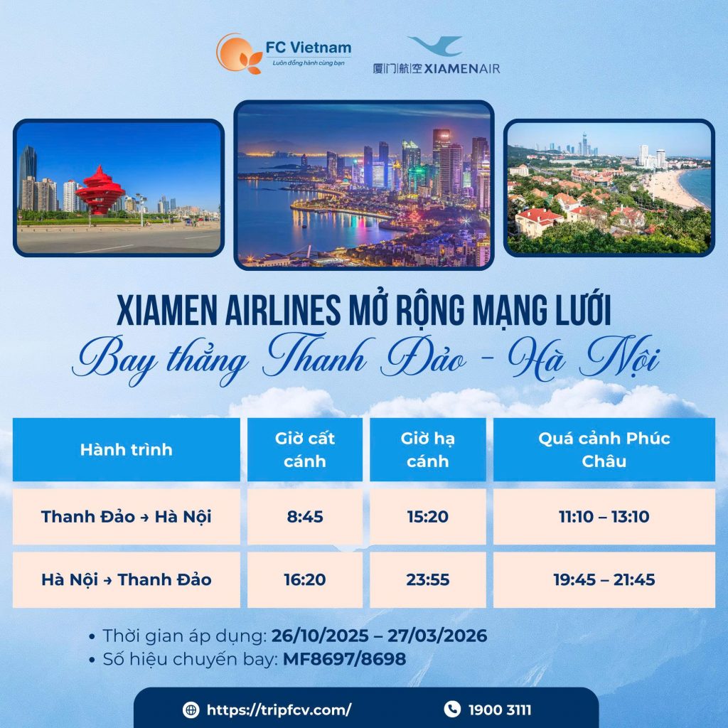 Xiamen Airlines mở rộng mạng lưới| Bay thẳng Thanh Đảo – Hà Nội 29 Tháng 9 , 2025 Xiamen Airlines hy vọng sẽ mang đến cho hành khách thêm nhiều lựa chọn thuận tiện, kết nối dễ dàng...