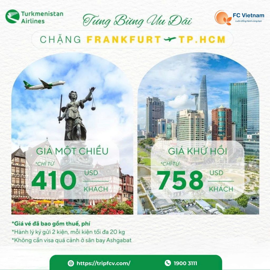 Tưng bừng ưu đãi cùng Turkmenistan Airlines 30 Tháng 9 , 2025 Frankfurt gọi, Sài Gòn chờ – còn chần chừ gì nữa? Tưng bừng ưu đãi cùng Turkmenistan Airlines Bay thẳng...