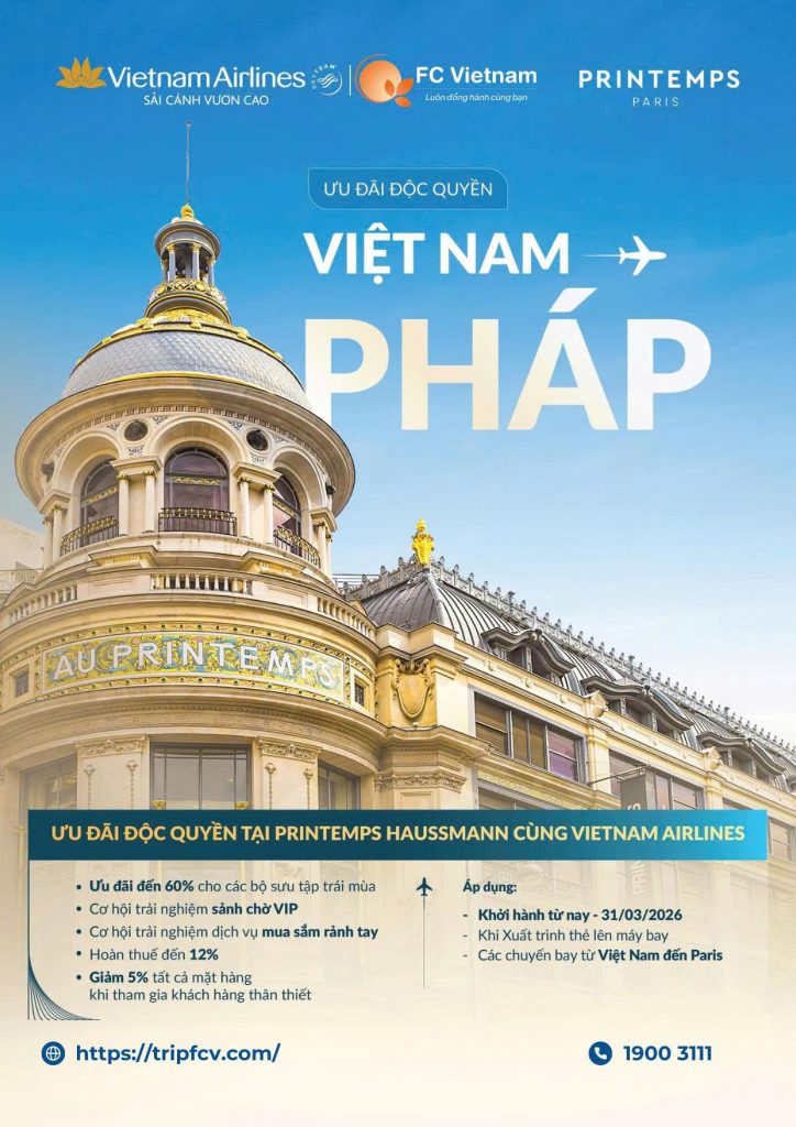 ƯU ĐÃI ĐỘC QUYỀN CHO HÀNH KHÁCH VIETNAM AIRLINES TẠI PRINTEMPS HAUSSMANN, PARIS 24 Tháng 9 , 2025 Khi đến Printemps Haussmann, hãy xuất trình boarding pass và Thư mời VIP để nhận ưu đãi! ƯU ĐÃI ĐỘC...