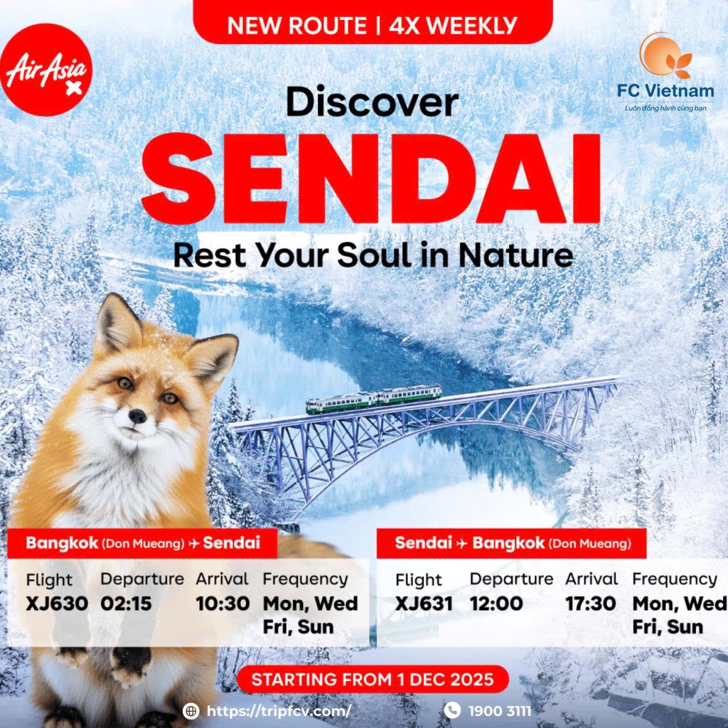 AirAsia X Thailand mở bán đường bay mới | Bangkok – Sendai & Bangkok – Riyadh 23 Tháng 9 , 2025 Đặt vé ngay hôm nay tại F.C Việt Nam để là những hành khách đầu tiên trên 2 đường bay...