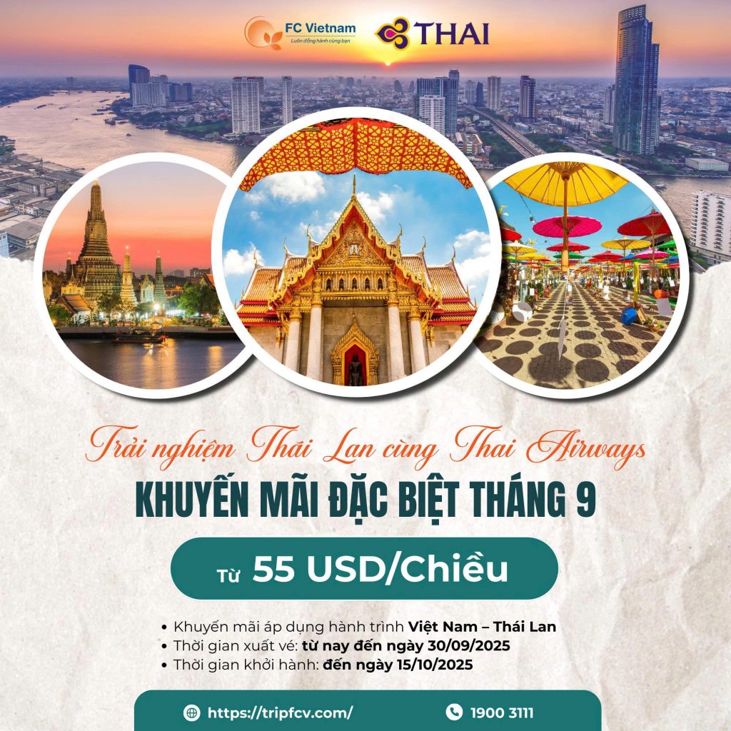 Trải nghiệm Thái Lan cùng Thai Airways | Khuyến mãi đặc biệt tháng 9 23 Tháng 9 , 2025 Số lượng có hạn – nhanh tay đặt vé tại F.C Việt Nam ngay hôm nay! Trải nghiệm Thái Lan...