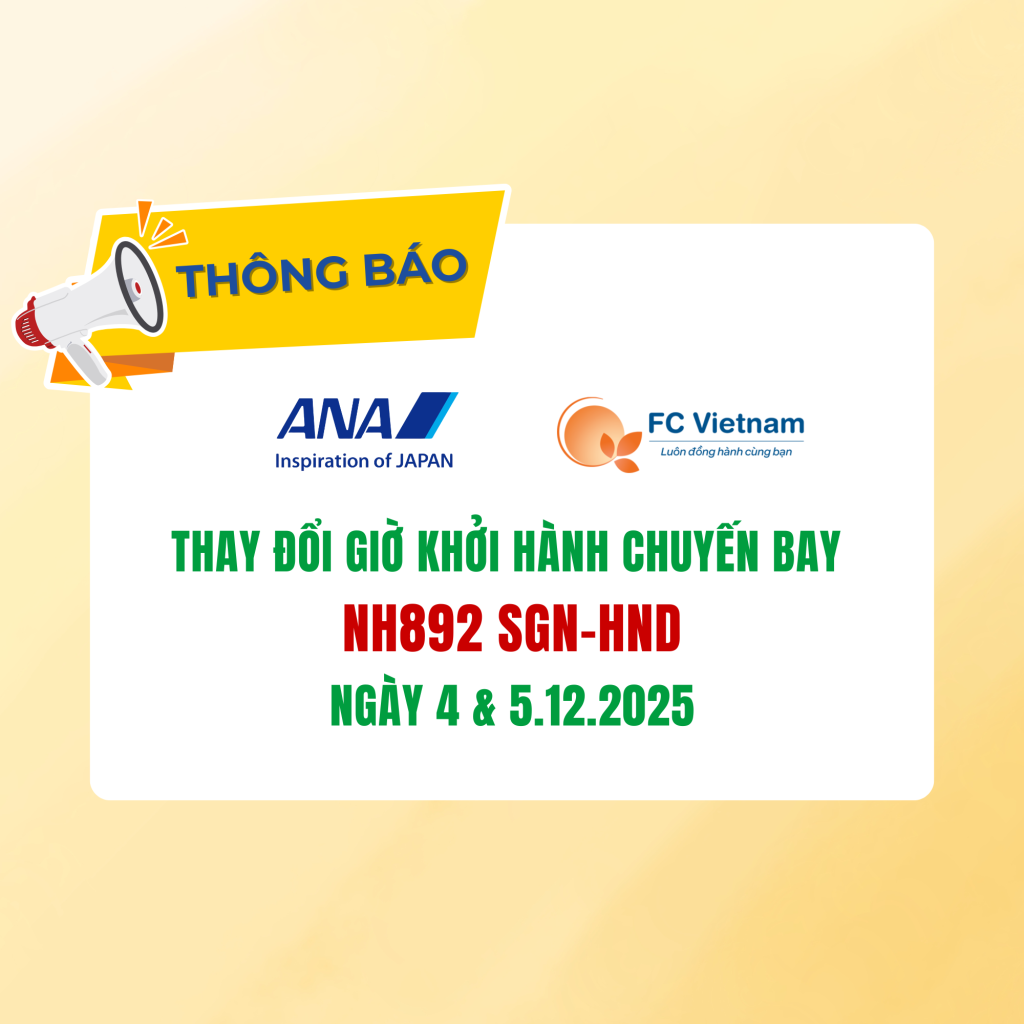 ANA | THÔNG BÁO THAY ĐỔI GIỜ KHỞI HÀNH 5 Tháng 12 , 2025 Kính mong Quý Hành khách chủ động kiểm tra lại hành trình và phối hợp thực hiện các thủ tục...