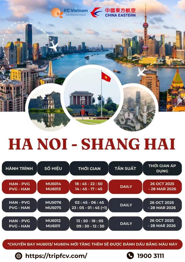 China Eastern Airlines | Tăng Tần Suất Chuyến Bay HÀ NỘI – THƯỢNG HẢI 5 Tháng 9 , 2025 China Eastern Airlines xin chân thành cảm ơn sự ủng hộ và đồng hành của Quý khách hàng. China Eastern...