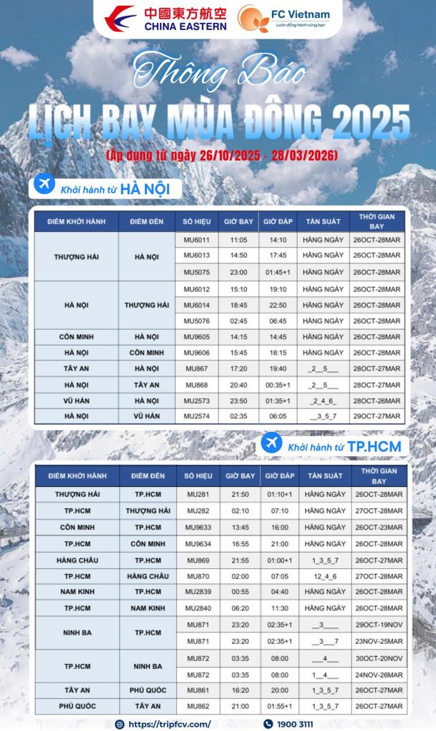 THÔNG BÁO LỊCH BAY MÙA ĐÔNG 2025 | China Eastern Airlines 14 Tháng 10 , 2025 Liên hệ F.C Việt Nam để giữ chỗ ưu đãi và nhận thông tin chi tiết! THÔNG BÁO LỊCH BAY...