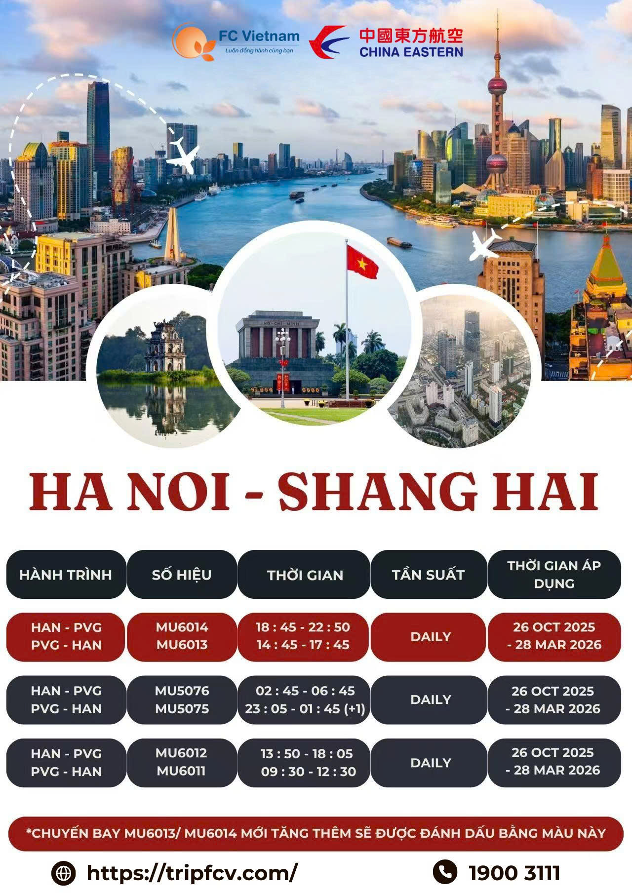 Nhằm phục vụ nhu cầu đi lại tăng cao trong mùa cao điểm lễ Tết sắp tới, China Eastern Airlines (MU) sẽ tăng thêm tần suất chuyến bay giữa Hà Nội (HAN) và Thượng Hải (PVG)