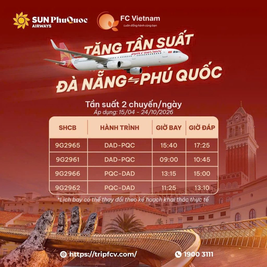 Tin vui cho team mê xê dịch: Sun PhuQuoc Airways đã tăng tần suất chặng Đà Nẵng – Phú Quốc lên 2 chuyến/ngày