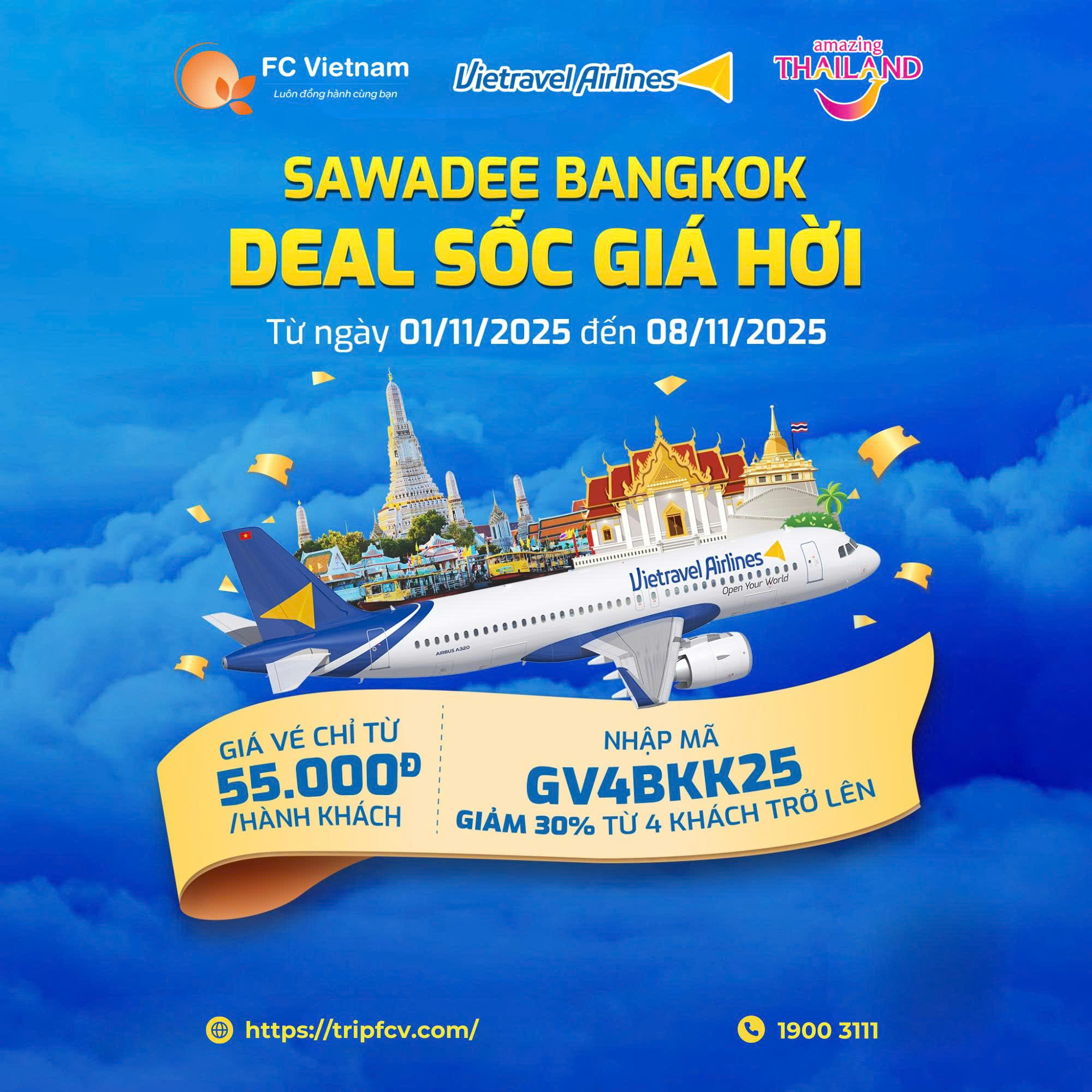 Vietravel Airlines tung ưu đãi siêu hời dành cho nhóm từ 4 khách trở lên, giảm liền 30% giá vé cơ bản cho hành trình đi/đến Bangkok.