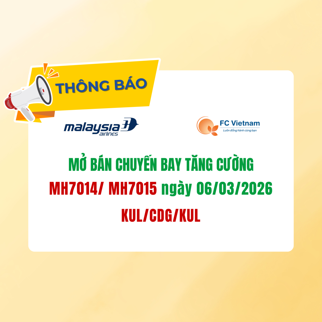 Malaysia Airlines thông báo mở bán chuyến bay tăng cường đặc biệt trên chặng Kuala Lumpur – Paris (CDG) – Kuala Lumpur vào ngày 06/03/2026, khai thác bằng tàu bay thân rộng Airbus A350-900, mang đến trải nghiệm bay thoải mái và dịch vụ đẳng cấp cho hành khách.