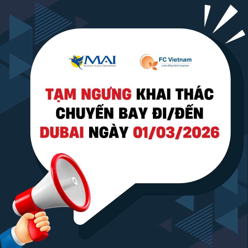 Myanmar Airways International (8M) xin cập nhật thông tin mới nhất, do tình trạng đóng cửa không phận tại nhiều khu vực Trung Đông, hãng thông báo tạm ngưng khai thác toàn bộ các chuyến bay đi/đến Dubai trong ngày 01/03/2026.