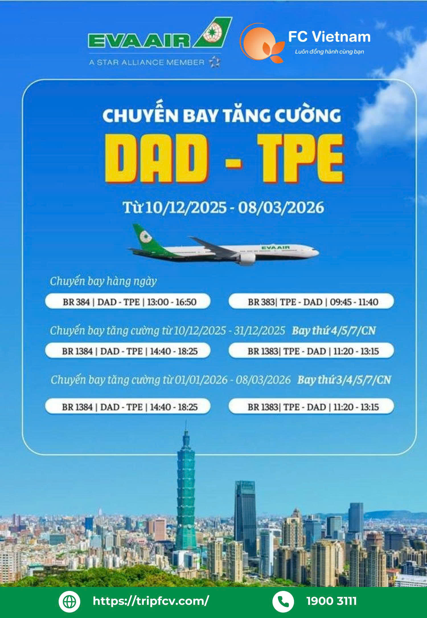 EVA Air trân trọng thông báo tăng cường chuyến bay từ 10/12/2025 – 08/03/2026, mang đến thêm nhiều lựa chọn thuận tiện cho hành khách bay từ Đà Nẵng đến Đài Bắc.