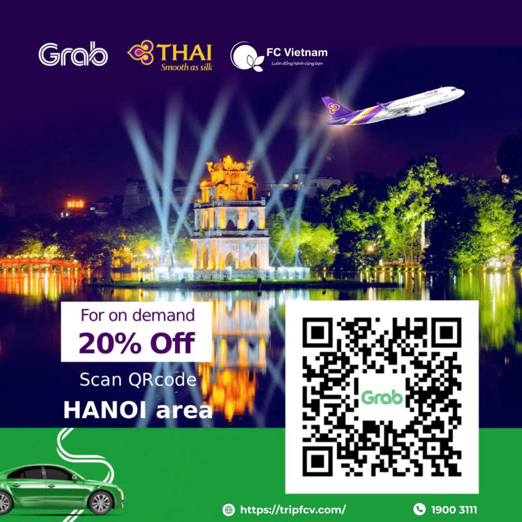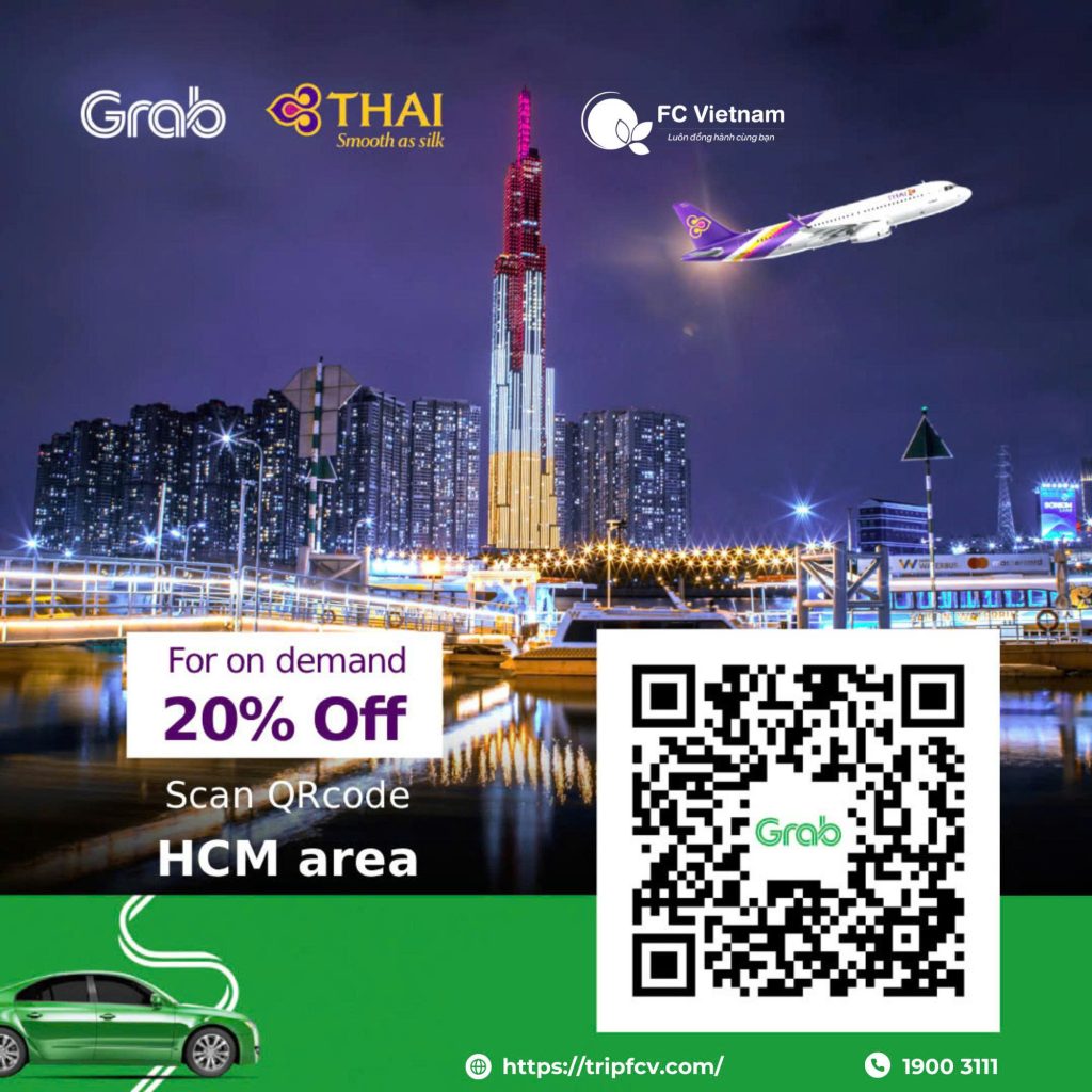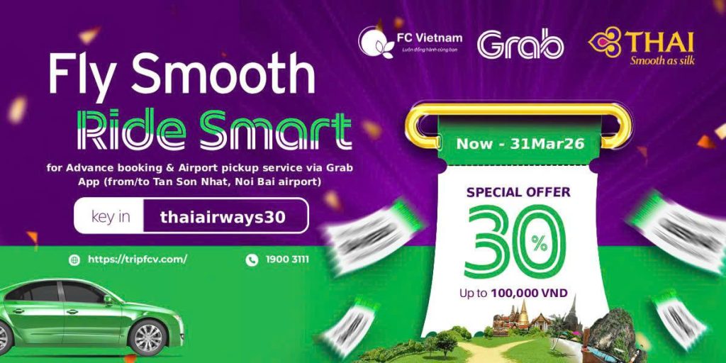 Hành khách của Thai Airways từ nay đến 31/03/2026 nhận ngay combo ưu đãi siêu chill khi đặt Grab đưa/đón sân bay Tân Sơn Nhất (SGN) hoặc Nội Bài (HAN).