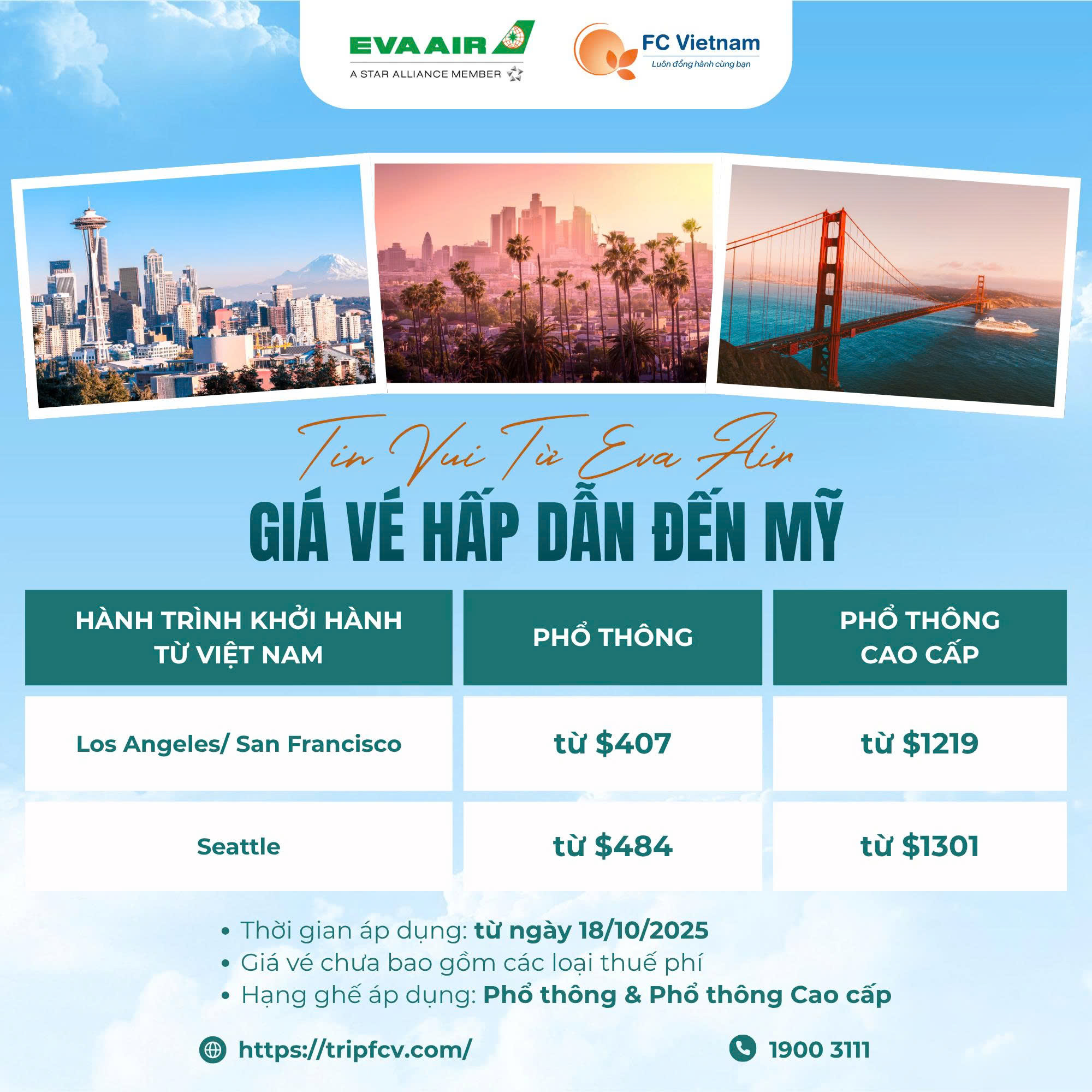 Cơ hội tuyệt vời để bay đến nước Mỹ xinh đẹp cùng Eva Air với mức giá siêu ưu đãi, dành cho các hành trình khởi hành từ Việt Nam.