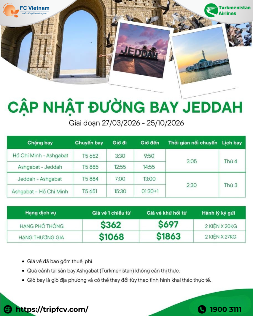 Giai đoạn 27/03/2026 – 25/10/2026, Turkmenistan Airlines chính thức khai thác đường bay đi Jeddah với lịch trình gọn – nối chuyến nhanh – giá vé dễ chịu.
