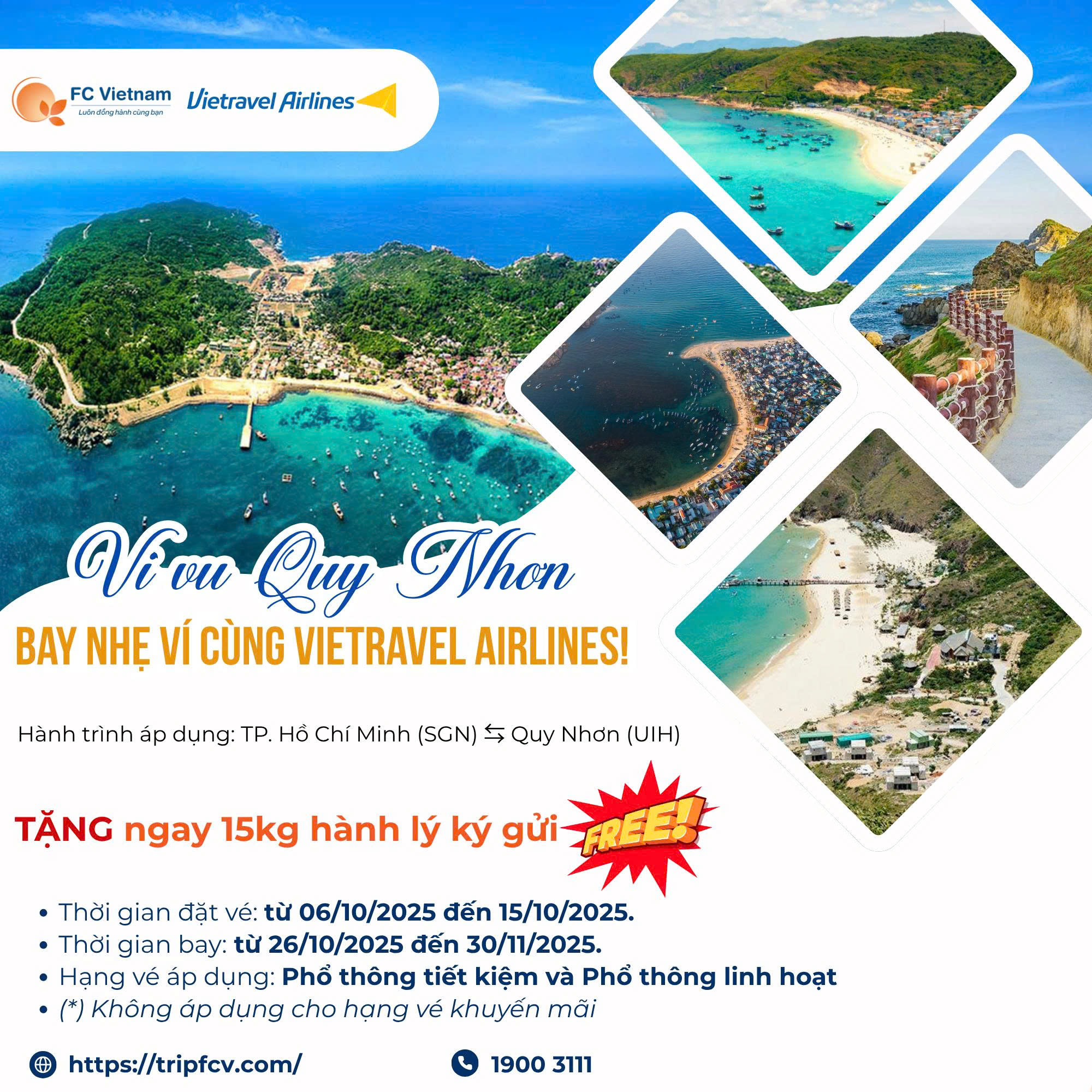 Vietravel Airlines TẶNG ngay 15kg hành lý ký gửi MIỄN PHÍ cho mỗi hành khách khi bay tuyến TP.HCM (SGN) ⇆ Quy Nhơn (UIH).