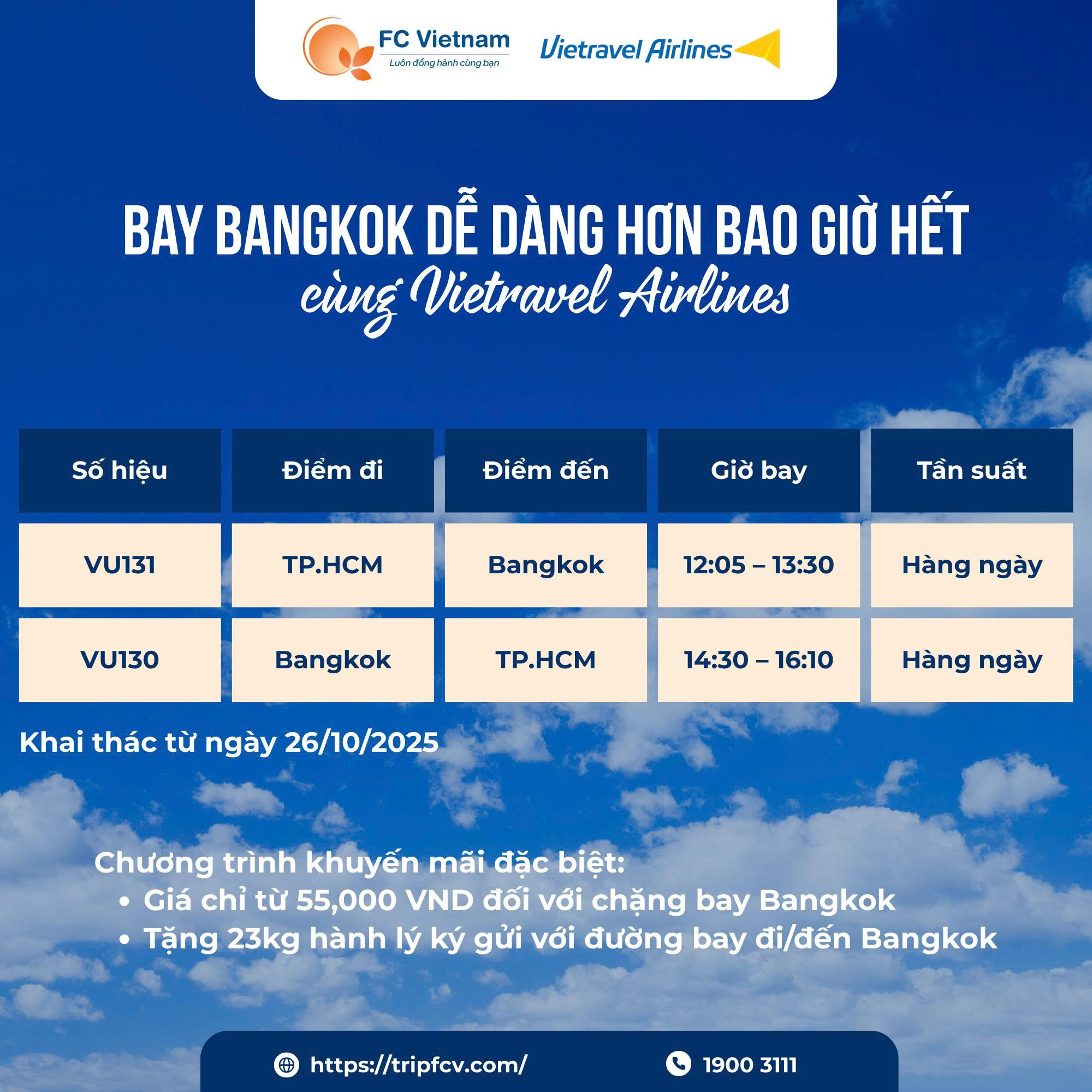 Từ 26/10/2025, Vietravel Airlines chính thức bay thẳng TP.HCM ⇆ Bangkok mỗi ngày.